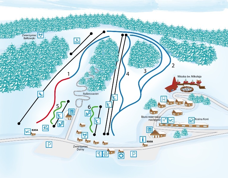 Trasy są różnego stopnia trudności: dominują trasy niebieskie, ale są także łagodne “zielone łączki” dla początkujących.